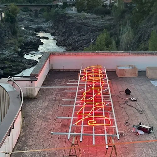 L’artiste Rémi Groussin a réalisé une œuvre monumentale sur la centrale hydroélectrique d’Arthès. Telle une extension de l’architecture, cette œuvre se compose d’un ensemble d’objets lumineux auxquels l’artiste a donné une seconde vie, dans une installation qui vient éclairer et révéler le paysage environnant. Rémi Groussin s’est inspiré de l’énergie délivrée par le lieu, dans ce paysage accidenté, théâtre d’épisodes industriels historiques. Pensée pour s’allumer à la tombée de la nuit, elle est reliée à un interrupteur crépusculaire (qui réagit à la luminosité) et s’allume environ 1 heure chaque jour à la tombée de la nuit. L’œuvre est à découvrir pendant 10 ans à Arthès.