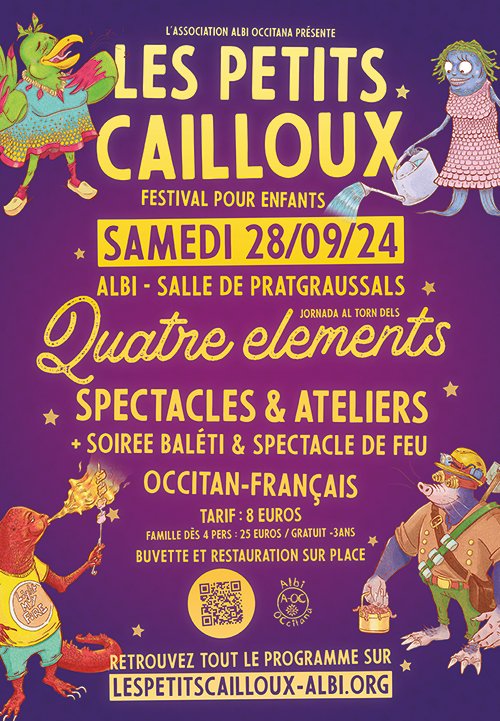 Beaucoup d’infos à vous transmettre pour cette rentrée ! On démarre par un rendez-vous de la fin du mois, le samedi 28, à ne pas manquer en famille. Les petits Cailloux est un festival pour enfants organisé par l’A-OC, l’association de parents d’élèves de la Calandreta, l’école bilingue occitane d’Albi. Un moment festif proposant de multiples activités pour enfants en lien, cette année, avec les « quatre éléments » : atelier d’argile, fabrication de moulins à vent, course de gobelets au fusil à eau, déambulation sur échasses… Balades contées, spectacle de feu et baleti (groupe Clica Drona) sont aussi au programme pour une journée qui vous emmènera de 11h à 22h.