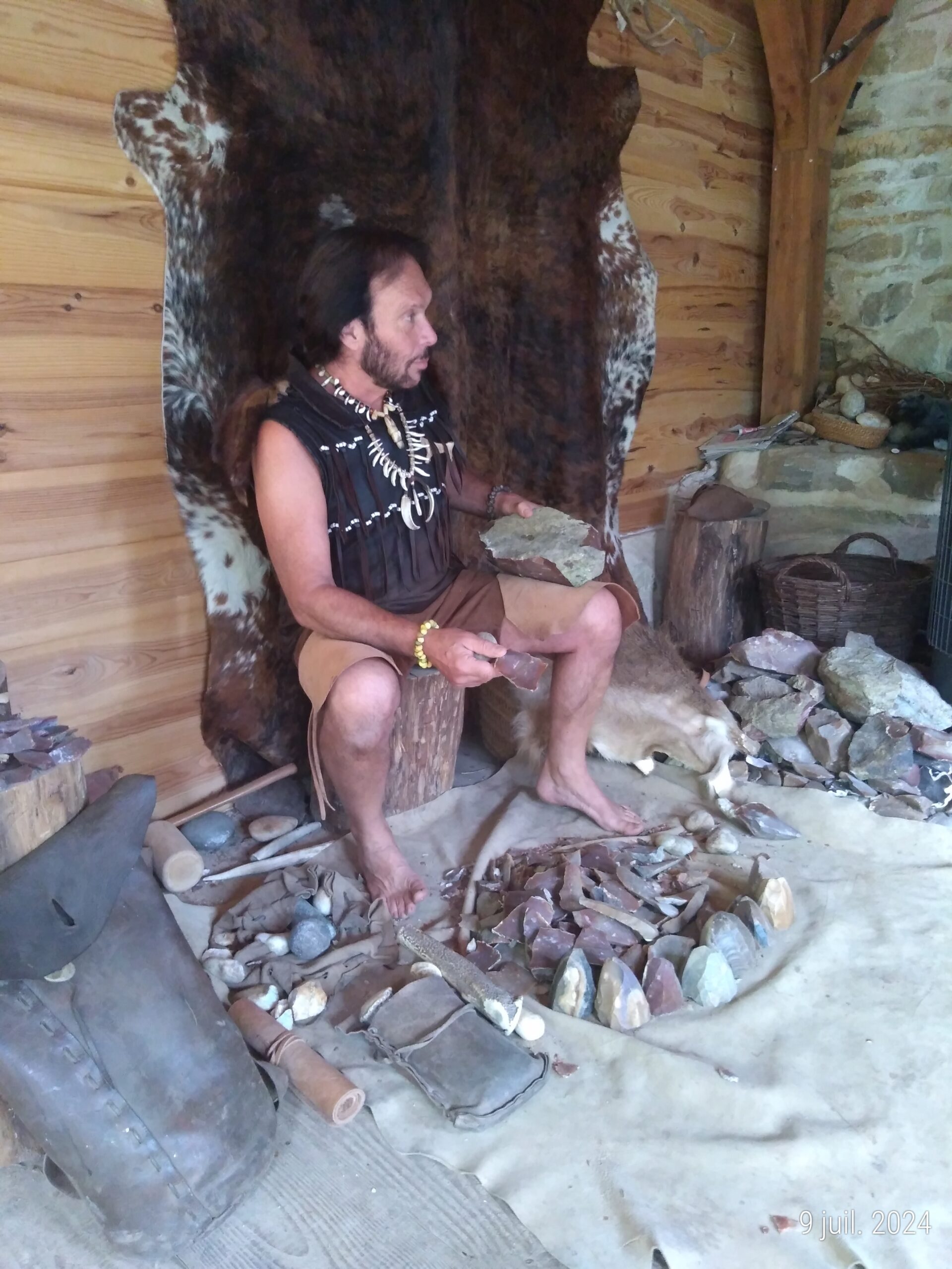 De grandes tentes de cuir, un feu qui crépite doucement… Quand on arrive sur le camp, on est tout de suite dans l’ambiance. Contrairement à beaucoup d’idées reçues, les hommes (et femmes) préhistoriques ne vivaient pas dans des grottes mais dans de grands tipis. Bernard “homme préhistorique… ou presque”, nous invite dans une salle de conférence où il nous offre une démonstration de taille de silex et nombre d’informations et d’anecdotes passionnantes.