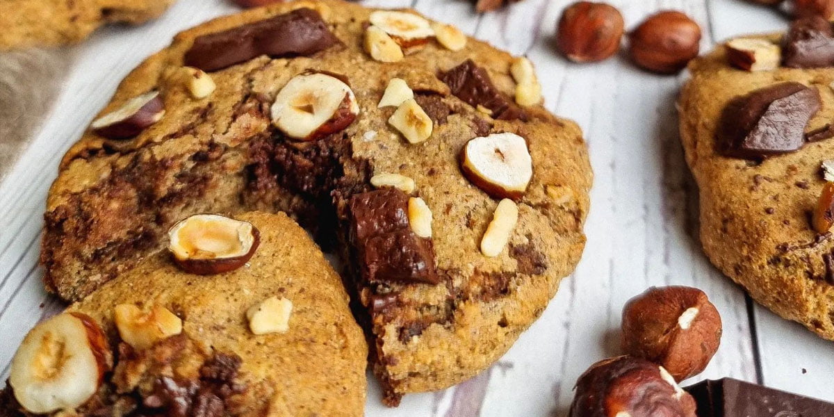 Nécessaires pour le moral de rentrée, ces cookies ultragourmands intègrent de la purée de noisettes, de la poudre et des noisettes entières. Pour les plus gourmands, cap sur le praliné de noisettes (ou les chunks de chocolat) qui contrasteront avec merveille avec la fleur de sel contenue dans le beurre salé.
