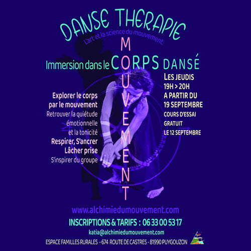 Katia propose des cours de danse mouvement thérapie à Puygouzon, dans les locaux de Familles Rurales. Reprise ce jeudi 12 avec un cours d’essai gratuit. « Se mouvoir et s’abandonner dans le lâcher prise pour accéder à la quiétude mentale / émotionnelle et l’équilibre postural », c’est l’objectif de l’Alchimie du mouvement… Venez tester !