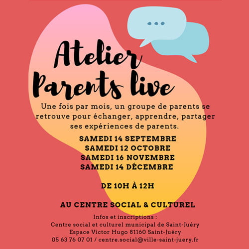 Une fois par mois (14/09 puis 12/10, 16/11 et 14/12), de 10h à 12h, un groupe de parents se retrouve au Centre social St-Juéry pour échanger, apprendre, partager ses expériences de parents.