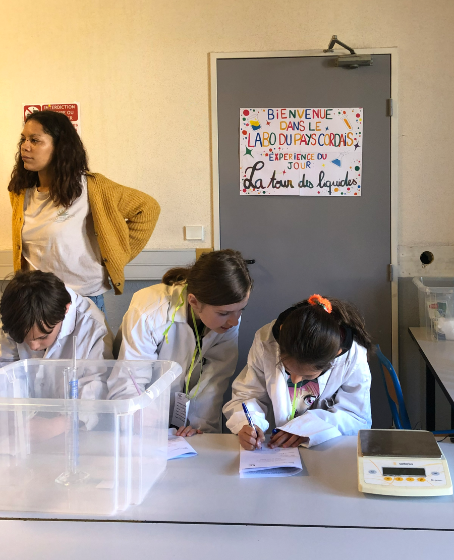 Nous avons pu échanger avec plusieurs étudiantes en biologie ou sociologie impliqués dans le dispositif. « Ce qu’on a aimé c’est de pouvoir tester la posture d’enseignant, puisque c’est nous qui animons, seules, les ateliers », soulignent Romane et Luna, qui ont développé des expériences sur la lunaison auprès de classes de CE2. « Les enfants sont très réceptifs, ils aiment tester, témoignent aussi Charlotte et l’autre Romane, investies sur les lichens. Aujourd’hui, c’est à leur tour d’expliquer ce qu’on leur a appris, ça va nous permettre de voir si notre pédagogie a marché. » Et ça fonctionne ! Répartis en ateliers, une partie des primaires tentent de transmettent aux autres la démarche de l’expérience, posent des questions, les aident à décrire et comprendre les phénomènes : mélange des liquides, changement d’état de l’eau, observation des lichens… Le rendu est riche et l’apprentissage en mouvement, d’ateliers en ateliers, aux côtés d’autres jeunes, ne fait qu’en renforcer l’efficacité…
