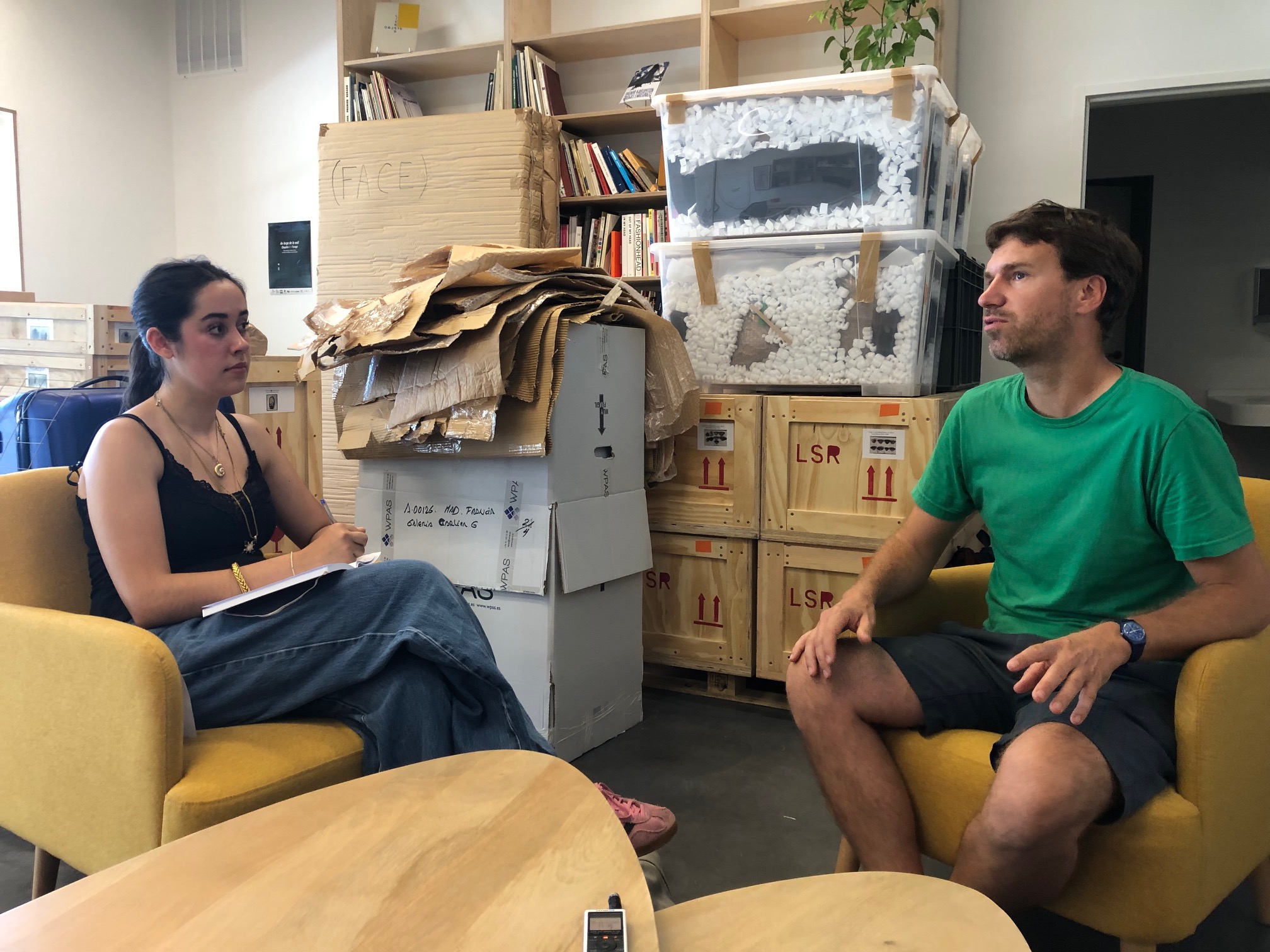 Félix Blume, à droite, interviewé par notre stagiaire Mélina, à gauche, dans un centre d’art en plein chantier, entre deux expos.