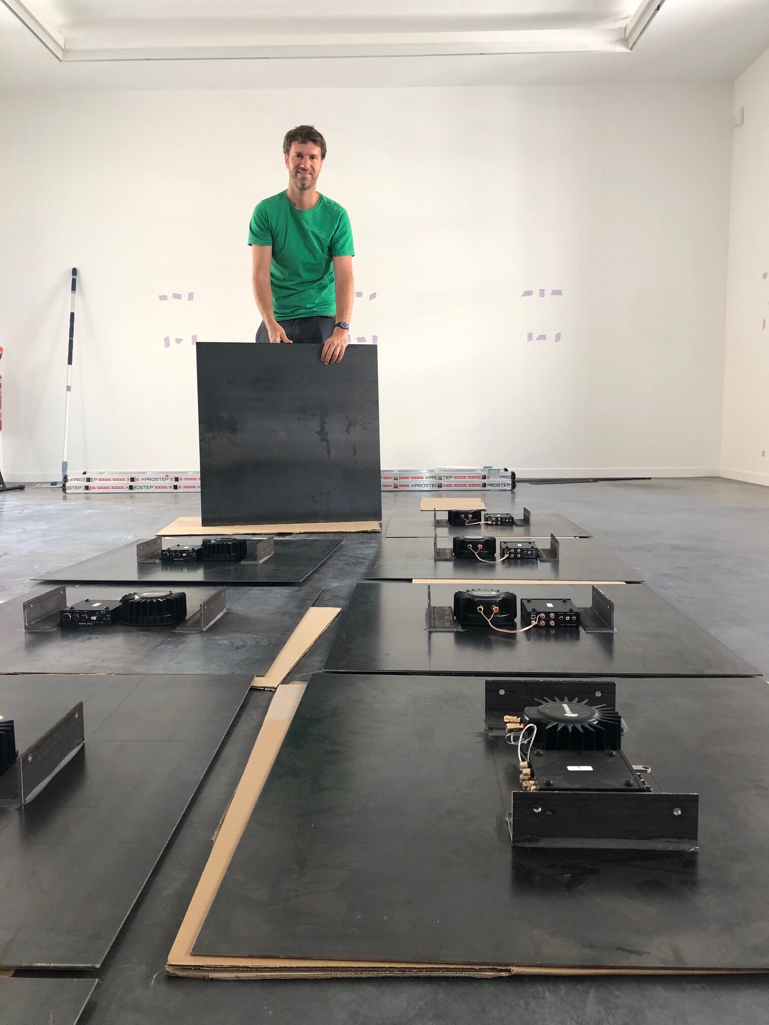 Félix Blume en pleine installation. En posant la main ou la tête sur chacune des plaques vibrantes qui seront installées au mur, on pourra se mettre dans la peau de personnes sourdes ou malentendantes.