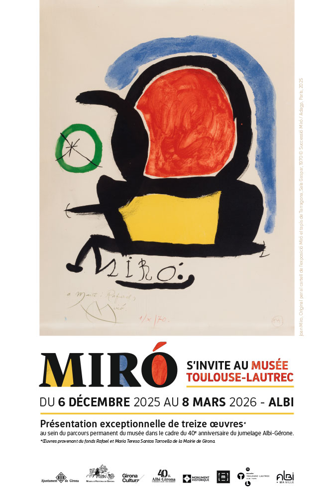 Accrochage exceptionnel de 13 tableaux de Miro au musée Toulouse-Lautrec. Ils seront présentées au sein du parcours permanent au deuxième étage du musée. Un prêt exceptionnel à l’occasion des quarante ans de jumelage entre Albi et Gérone…