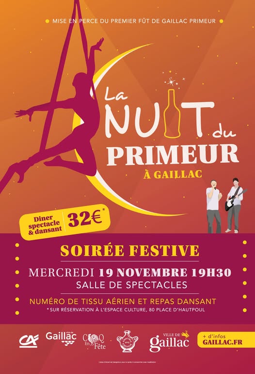 Chaque année, le Gaillac Primeur est dévoilé le 3ᵉ jeudi de novembre. Pour célébrer cette sortie tant attendue, la Ville de Gaillac, avec la complicité pétillante de Coq en Fête, vous invite à une soirée haute en couleurs le mercredi précédent, avec à minuit la mise en perce du tout premier fût de Primeur. Cette année, ce sera le 19 novembre à partir de 19h30. Repas, spectacle, orchestre et révélation du Gaillac Primeur à minuit…