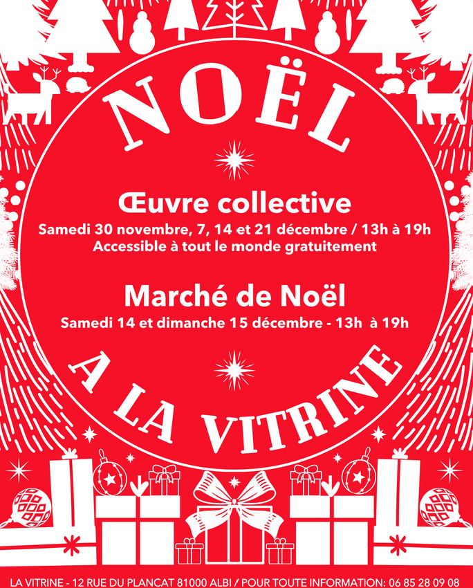 Léa Sanchez vous invite dans son atelier d’artiste, La Vitrine, pour participer à la réalisation d’une œuvre collective les samedis du mois de décembre (7, 14 et 21) de 13h à 19h. Travaillant autour du thème de la symétrie, elle va réaliser sur toile une couronne de Noël, qui sera à décorer par les participants. Vous pourrez suivre jour après jour son évolution sur les réseaux. Cette œuvre sera exposée dans son atelier d’artiste durant toute la période des fêtes. Gratuit et accessible à tous !