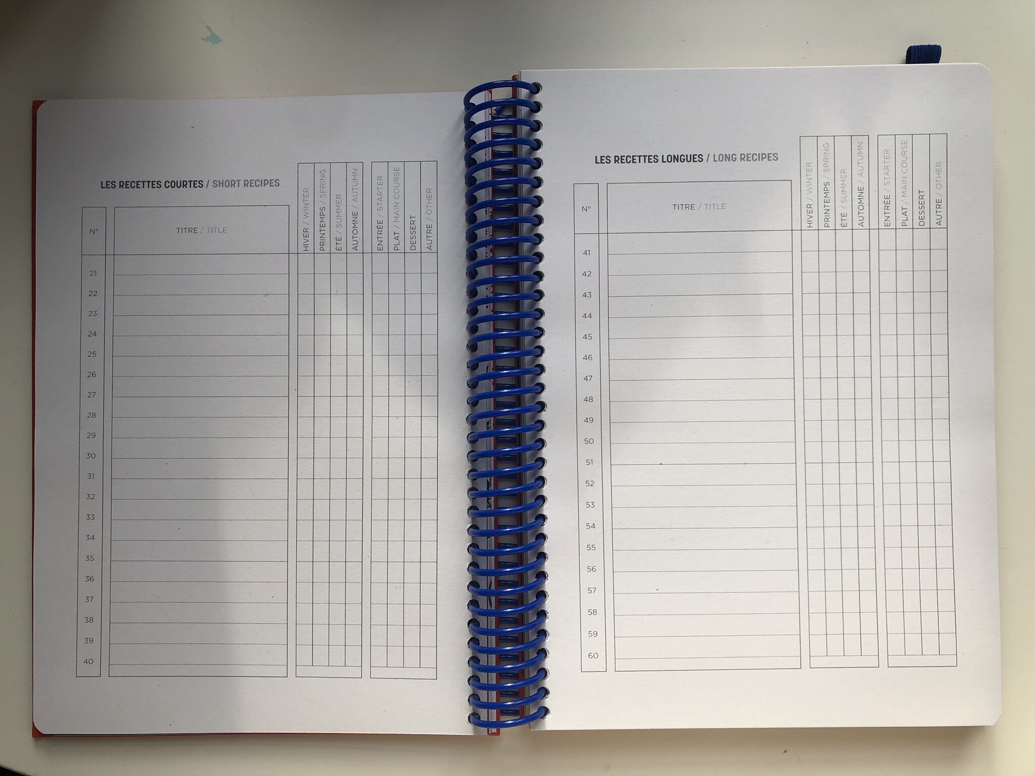 Vous y trouverez déjà la liste des fruits & légumes de saison, un sommaire à compléter pour retrouver facilement vos recettes, des notes pour garder la trace de vos menus préférés et invités conviés et 80 pages de recettes à remplir pour ne jamais les oublier….